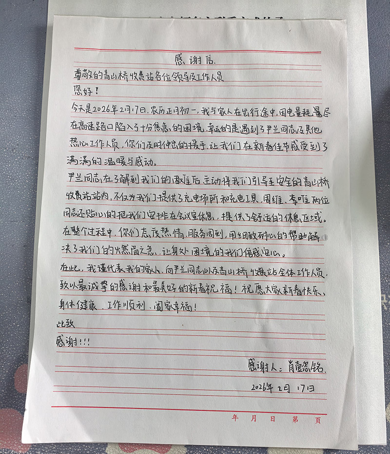 2月17日(农历正月初一)16时许,青山桥收费站出口处,一辆电动车电量耗尽,车主肖女士一家从岳阳赶回老家团圆,却在离家仅"一公里"处进退两难。当班班长尹兰见状主动上前,引导车辆进入站内安全区域,工作人员迅速接通电源,并将肖女士一家请进会议室休息。一杯热茶、一盘果盘,让冰冷的会议室有了"家"的温度。临行前,肖女士手写感谢信:"尹兰同志主动引导我们进站充电,周维、李唯两位同志贴心安排休息……让身处困境的我们倍感安心。"