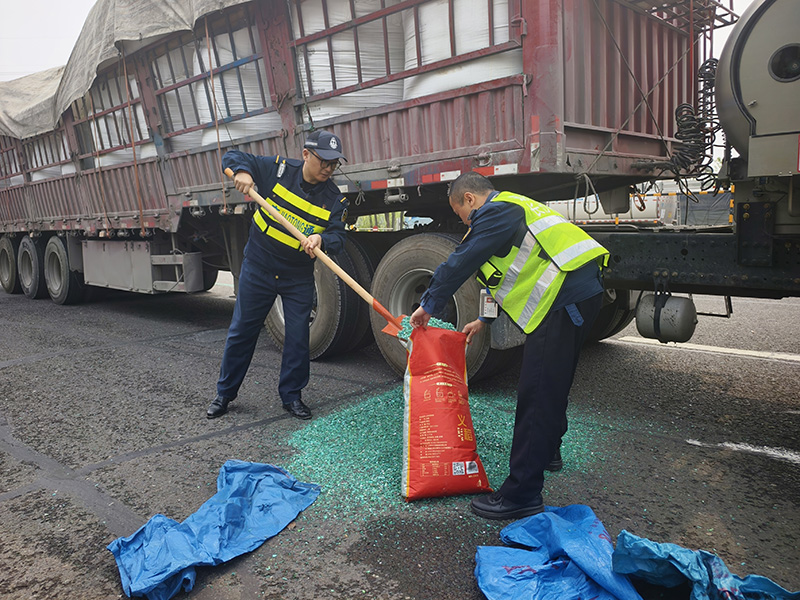 4月13日上午,一辆满载聚丙烯破碎料的货车刚驶入马家河收费站,包装袋突然裂开,绿色碎料瞬间铺满了车道和广场。值班副站长罗旦一边安抚焦急的司机,一边迅速组织清理。大家用铁锹和扫帚将散落的碎料归拢装袋,又帮司机重新捆绑加固货物。细碎的颗粒沾满了衣裤和双手,却没人停下动作。半小时后,货车恢复安全状态,司机连声道谢。