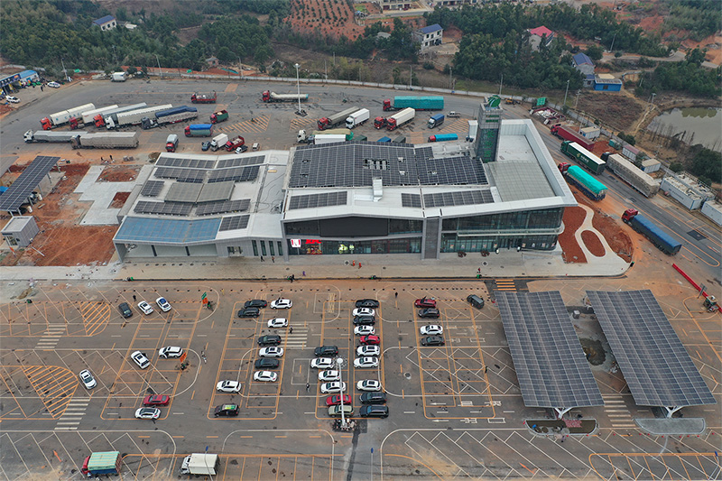 · 花明楼服务区利用柔性支架技术,在边坡成功建设光伏电站,并融合生态景观。