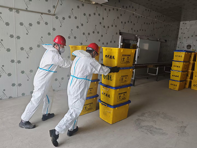 工作人员在低温暂存间转运医废周转箱